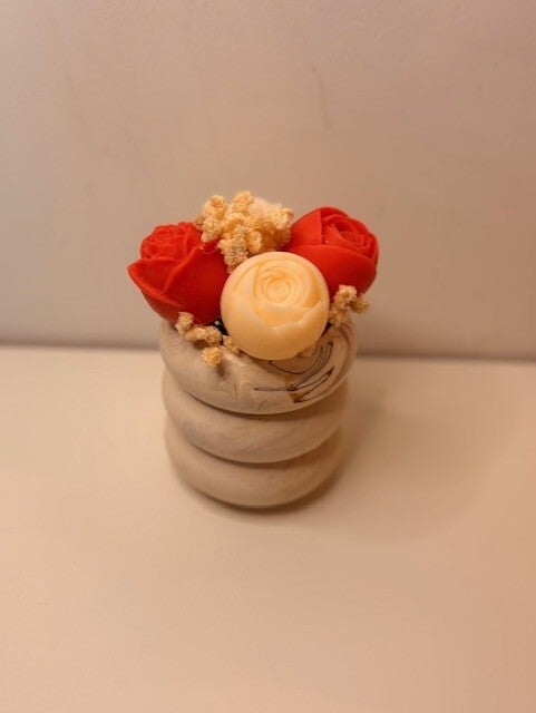 Composition disposée dans un vase en Jesmonite confectionnée à la main (Vase), tons beige et marrons. Les fondants sont composés de 93% de cire de Soja Naturelle et 7% de Parfum de Grasse, senteur Vanille.