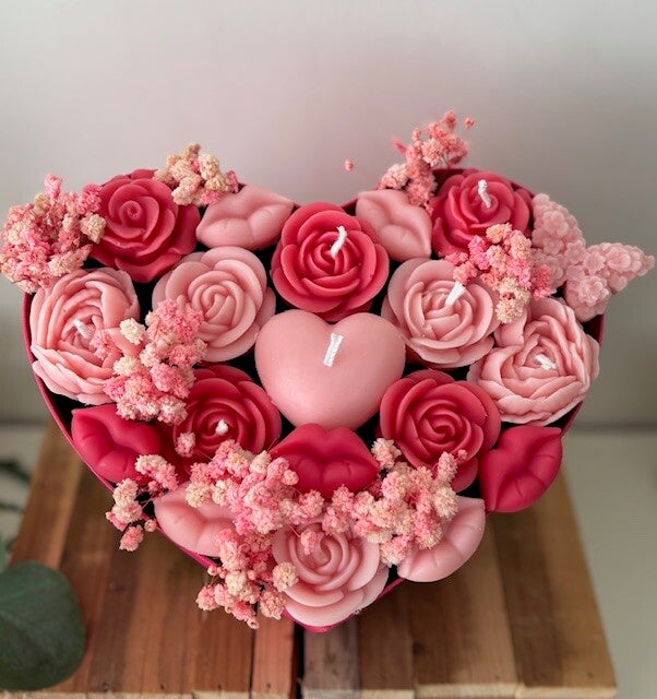 Création faite de cire de soja naturelle assemblée dans une boite rouge ou rose en forme de coeur.